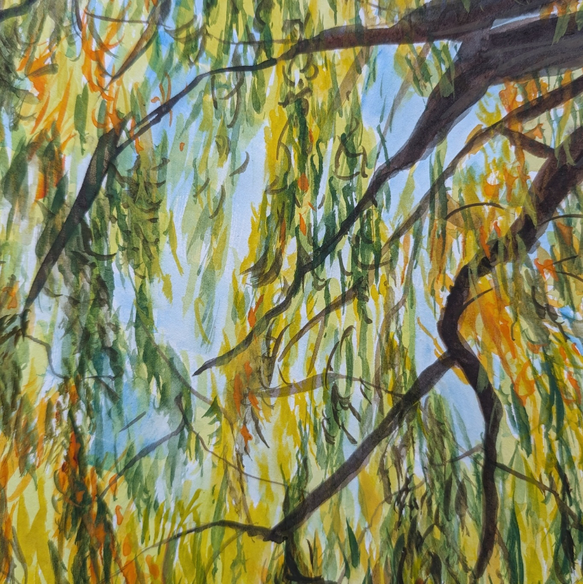 When I did that, my immediate thought was that I wanted to try to paint what I was seeing and feeling there. The photograph I posted yesterday is a different view, taken to highlight the sun itself, and it’s cropped. This watercolor, done in my sketchbook today, attempts to capture the delicacy of all the small willow leaves, the pliable branches that sway off the massive main trunk, and the light as it shines through the leaves. The textile-like tapestry of leaves, golden on the outside, dark olive green on the inside, was set off by the pure blue of the sky seen through the millions of spaces between the leaves.